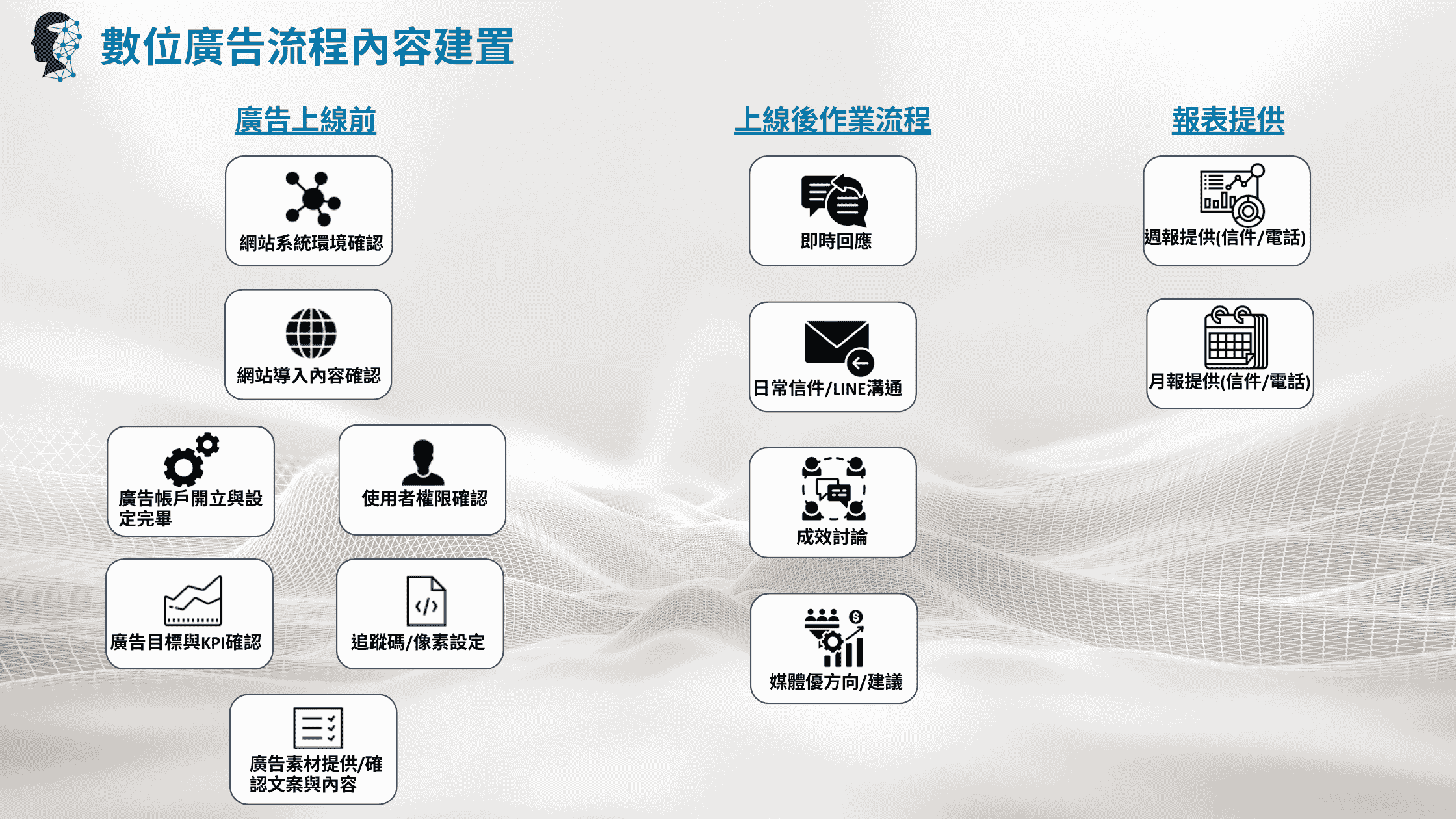 數據洞察為主,驅動成效,並以優質的素材與內容為王,提升品牌的價值與績效,找出問題對症下藥