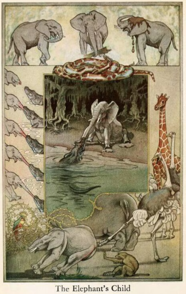 (圖片與詩歌資料參考來源:https://americanliterature.com/author/rudyard-kipling/poem/the-elephants-child-poem)
