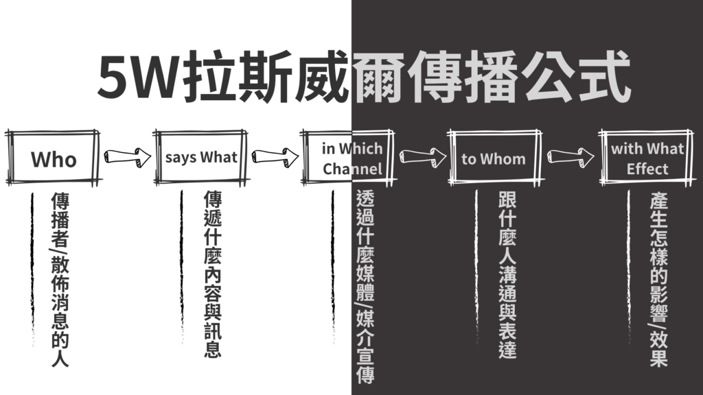 拉斯威爾的傳播模型“Who said What in Which channel to Whom with What effect?”「誰傳播了什麼?透過什麼渠道?讓誰接受到?後續造成怎樣的影響與效果?」,這個具體化的結構可以把它拆解成「WHO」、「WHAT」、「WHY」、「WHEN」、「WHERE」5W模式,這也是常聽到英文疑問句中的第一個英文字母