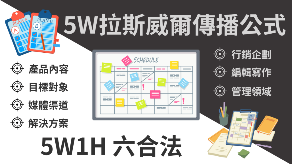 藉由拉斯威爾傳播模式5W、與5W1H「六合法」的分析應用,有助於數位行銷方面的規劃,找運用不同的媒體渠道與廣告數據帶來的結果,幫助我們分析各項指標成效是否有達成預期,以便隨時調整品牌的策略,更能保持競爭力!